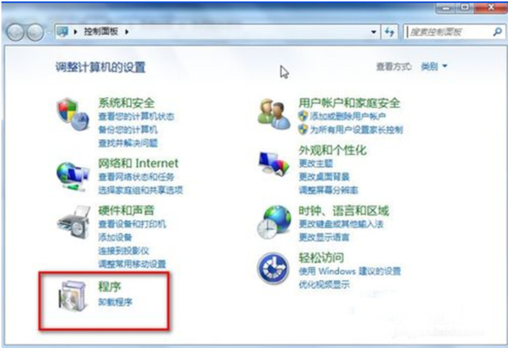1.首先打开“控制面板”,在“控制面板”类别下,选择“程序”