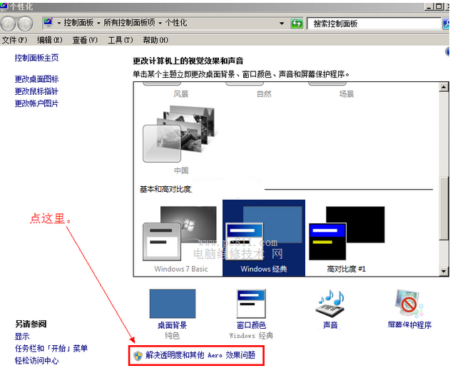 2、在打开的个性化窗口中,在窗口底部点击“解决透明度和其他AERO效果问题”选项。