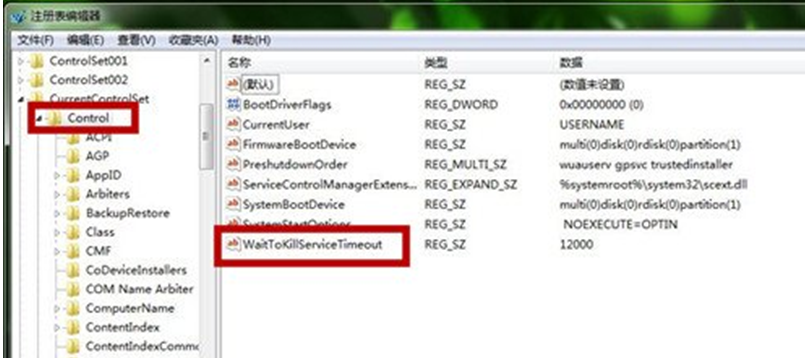 2、在打开的“注册表编辑器”的窗口中,依次找到“HKEY_LOCAL_MACHINE\SYSTEM\CurrentControlSet\Control”。在右侧窗口中找到并双击“waitToKillServiceTimeout”。