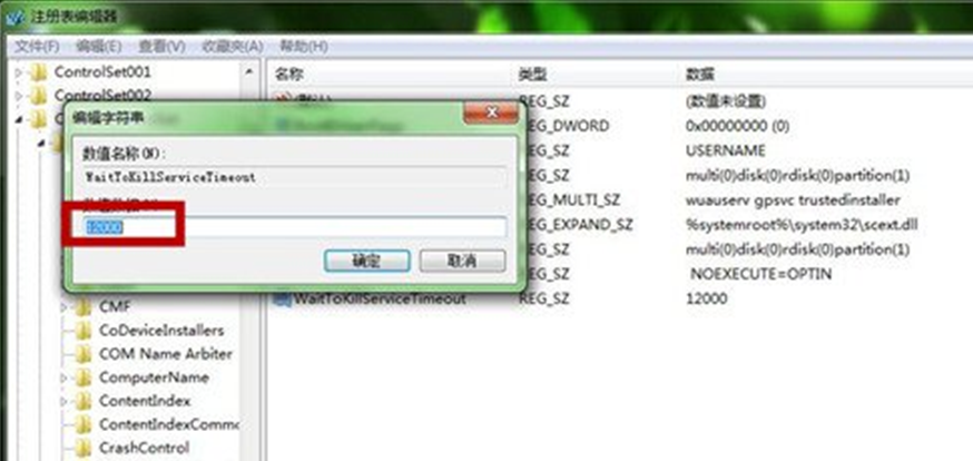 3、弹出的“编辑字符串”窗口,此时就可看到默认的“数值数据是12000”,即代表12秒,然后将数值数据中的12000改为1000,即1秒,然后点击“确定”。