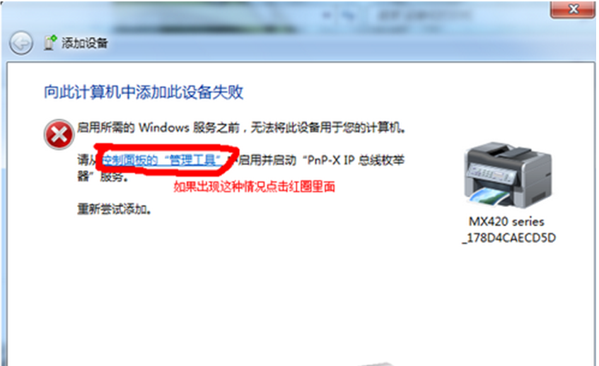 3、然后选择需要添加的扫描仪,如果添加失败,会自动弹出下图示,选择“控制面板-管理工具”。