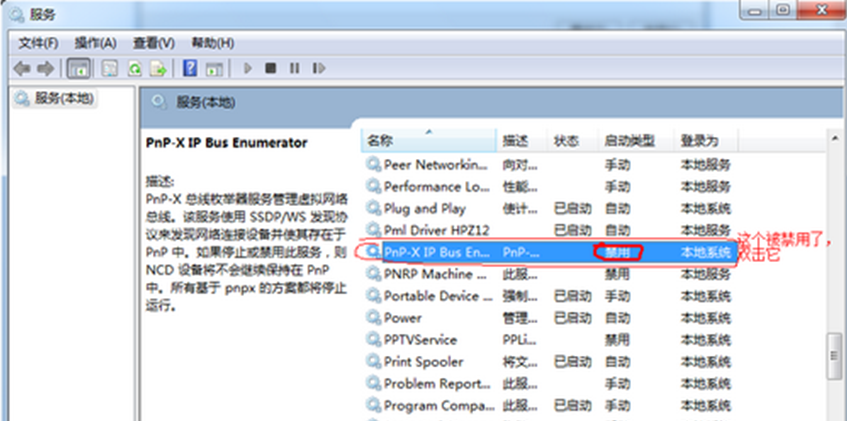 4、点击服务,在下拉菜单中找到并选择PnP-X IP Bus Enumerator,由于这个启动类型被禁用了,双击打开属性窗口。