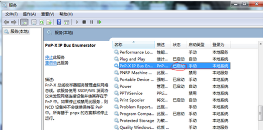 6、启动过后,在服务窗口中你就会发现PnP-X IP Bus Enumerator的状态是“已启动”的。
