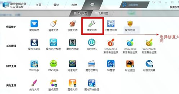1.选择软媒的功能大全,然后选择修复大师,点击打开。如图: