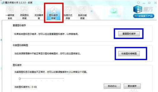 1.点击“图标缓存修复”—“重建图标缓存”—“恢复图标缩略图”即可。