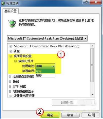 5.进入高级设置窗口,在当前电源计划下,展开“桌面背景设置->放映幻灯片”, 将设置配置为“可用”状态。