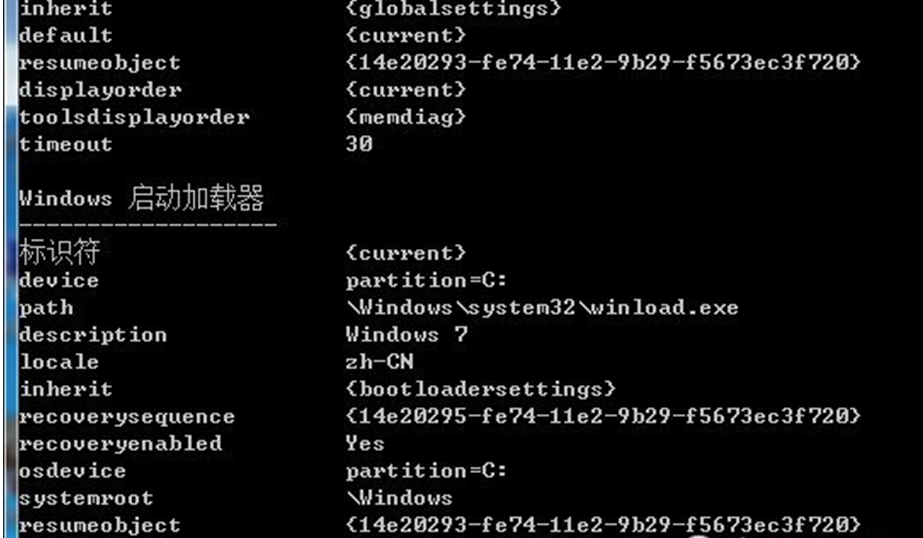 2、在打开的命令提示符窗口中键入“bcdedit”,检查一下Windows启动管理器和Windows启动加载器下locale对应的语言是否与Windows 7系统语言一致,zh-CN”代表中文版。