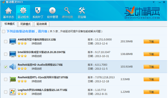 1. 首先下载驱动精灵,打开驱动精灵,切换到“驱动程序”选项,将WIN7计算机的声卡更新到最新版本,如图示。