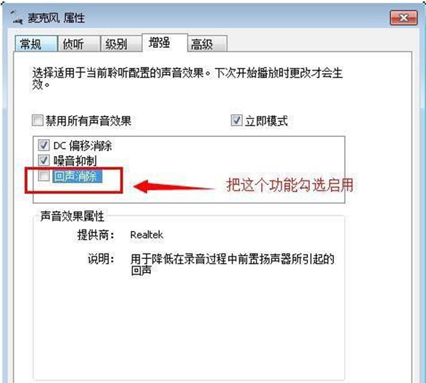 3、在打开的麦克风属性窗口中,切换到“增加”标签页,将“回声消除”功能前面打勾,启用回声消除功能。