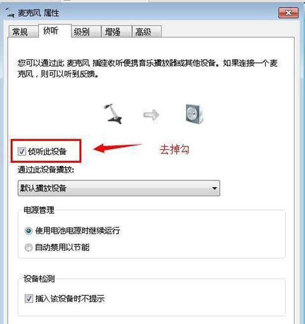 5、切换到“侦听”标签页,去掉“侦听此设备”前面的勾去掉麦克风底层的声音,然后保存。