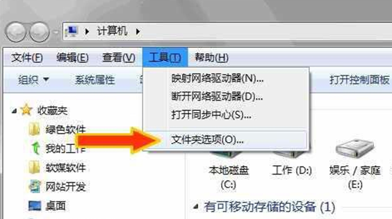 1.按“Win+E”组合键直接打开资源管理器,点击“工具”选择“文件夹选项”。