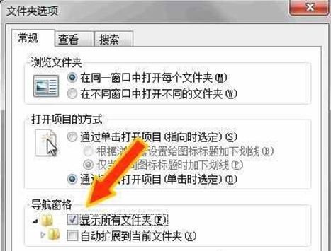 2.在文件夹选项的导航窗格选中“显示所有文件夹”,单击“确定”即可。