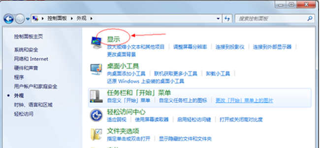 1、点击“开始——控制面板——外观——显示”