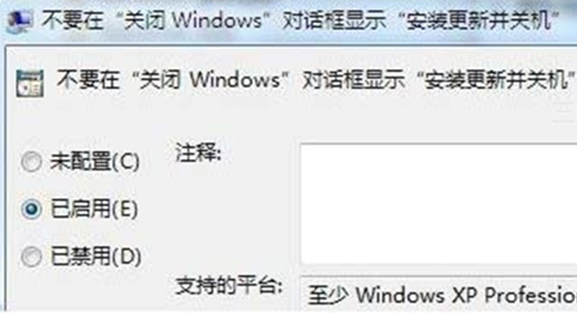 2. 在组策略编辑器中依次展开“用户配置→管理模块→Windows 组件→Windows Update”,双击右侧窗口中的“不要在关闭Windows对话框显示是否安装并更新”。然后在弹出的窗口中,点选“已启用”,最后单击“确定”按钮保存设置。