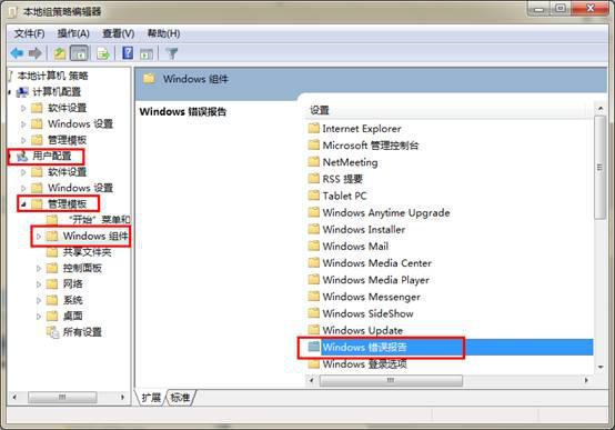 2、在打开的本地组策略编辑器,依次点击“用户配置”—— “管理模板”——“Windows组件”——双击“Windows错误报告”。