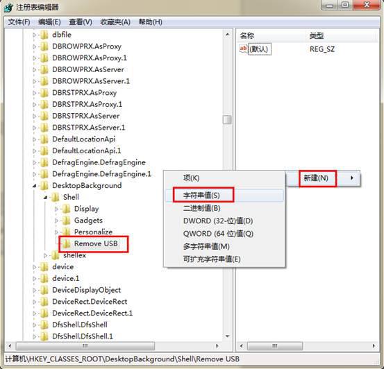 2、在打开的注册表管理器中,依次打开以下注册表项HKEY_CLASSES_ROOT/DesktopBackground/shell。然后右击Shell,选择“新建——项”,把新键重命名为”Remove USB”。