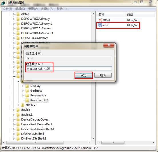 4、在Icon项上双击,在弹出的编辑字符串中将“数值数据”中输入hotplug.dll,-100后,点击“确定”。