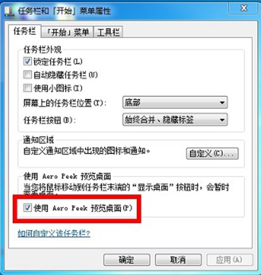 如果重启问题仍旧时,在任务栏处右击选择属性,看看是否预览桌面的选项关了,如果是在任务栏标签页中,将“使用Aero peek预览桌面”前面的勾不小心取消了的话,直接将此处前面打上勾即可。