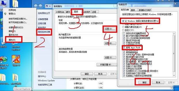 右击“计算机”选择“属性”,点击“高级系统设置”,然后在打开的“系统属性”切换到“高级”标签页,在“性能”处选择“设置”,弹出“性能选项”在“视觉效果”标签页中,点选“让window选择计算机的最佳设置”同时勾选“启用 Aero peek的选项”点击“确定”保存即可。