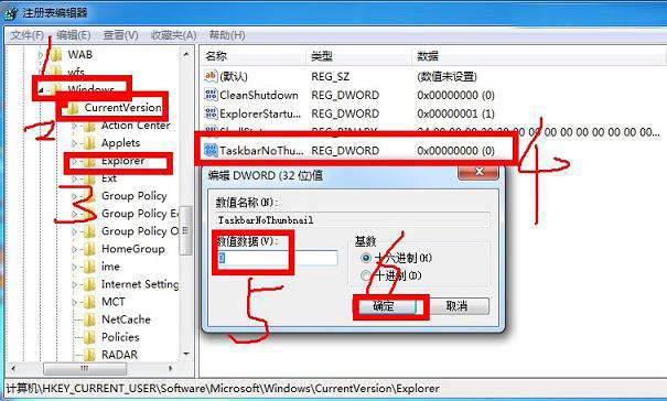 按“win+r”打开“运行”窗口,输入“regedit”命令后按回车打开注册表编辑器,依次打开HKEY_CURRENT_USER/Software/Microsoft/Windows/CurrentVersion/Explorer(如果没有Explorer选项时右键新建一个)新键DWORD键值TaskbarNoThumbnail,双击我们会看到键值,将数值数据改为0,就是打开的意思,点击确定保存后退出注册表即可。