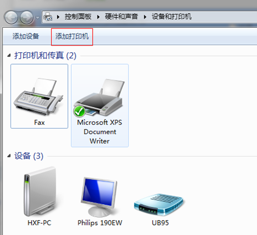 1、打开控制面板,选择“设备和打印机”,点击“添加打印机”。