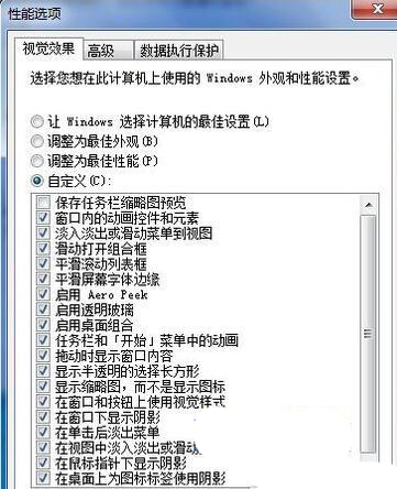 3、弹出“性能选项”窗口,点选自定义,找到“在桌面上为图标标签使用阴影”选项,将此选项前面的勾去掉,点击“确定”保存后退出即可。
