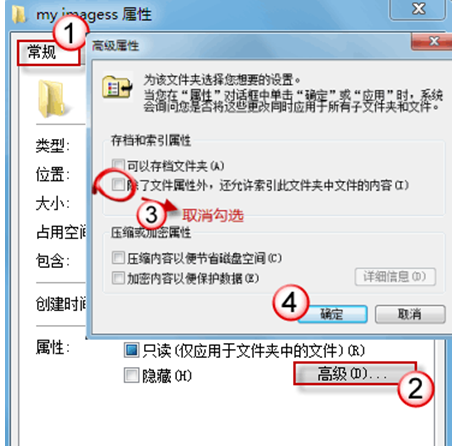 2、如果是在文件夹属性窗口中,切换到“常规”标签页,点击“高级”按钮,在“高级属性”中,将“除了文件属性外,还允许索引此文件夹中文件的内容”的勾选去掉。