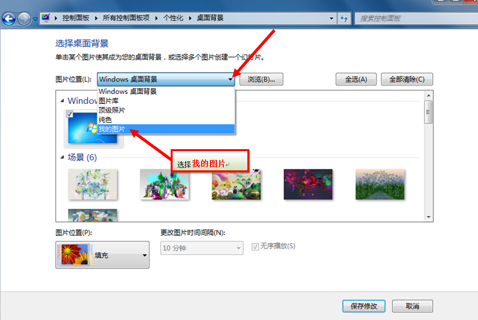 4、在桌面背景设置界面中,图片位置处点击小三角下拉中的“我的图片”,然后保存修改。