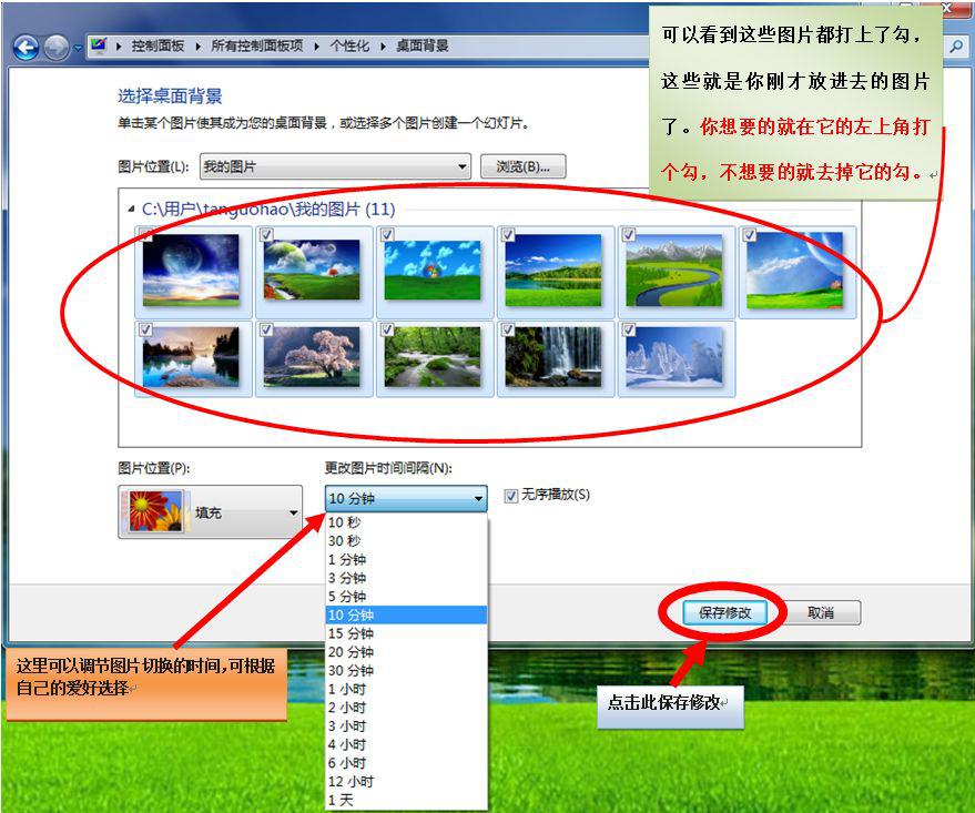 5、勾选喜欢的图片,设置图片时间间隔,点击“保存修改”。