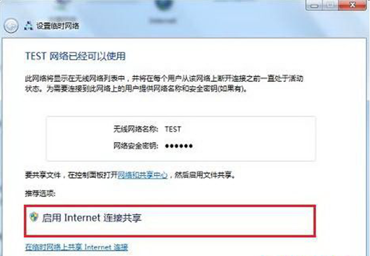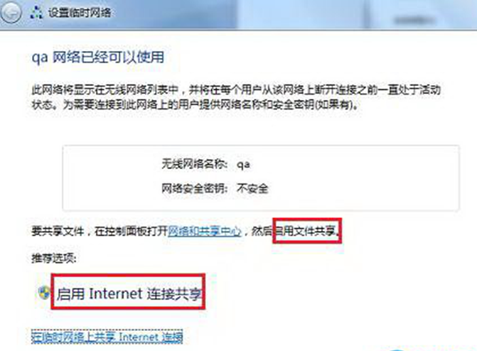 5、此时无线局域网已经可以使用,如果用户想在电脑间共享文件,请按照如图提示启用文件共享即可。