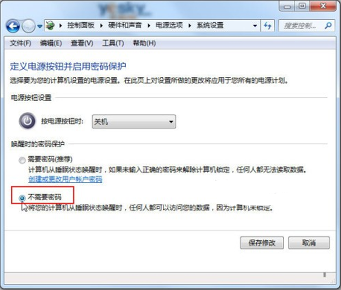 4、此时“唤醒时的密码保护”下面设置状态变为可设置状态,点选“不需要密码”,然后按“保存修改”退出就OK了。