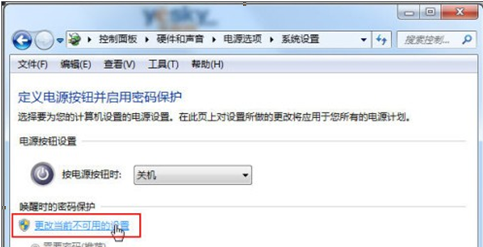 2、然后系统进入控制面板-硬件与声音-电源选项-系统设置面板中,点击“更改当前不可用的设置”。