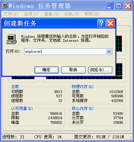 3.在弹出的“创建新任务”对话框中输入“explorer”点“确定”。