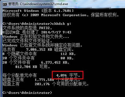 3、此时,校验检测完u盘后,我们能够看到其中点事的分配单元为“4096字节”,注意:通常这个分配单元值默认都是为4096字节。
