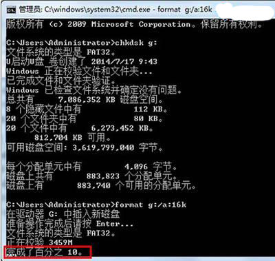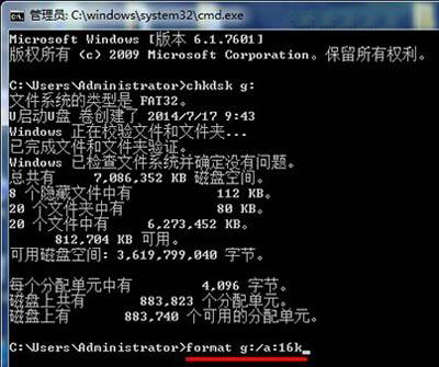 4、然后在光标处输入“format g:/a:16k”按回车键,以上相同这里的g为u盘盘符。