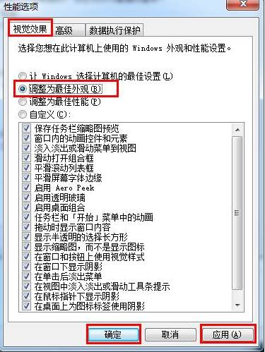 第三,系统会出现性能选项窗口,在窗口最上面找到并点击视觉效果选项卡,可以进入到视觉效果窗口,在窗口中找到调整为最佳外观选项,使用鼠标选中这个选项,选中之后点击窗口最下面的应用和确定按钮,确保之前的设定可以正式生效。