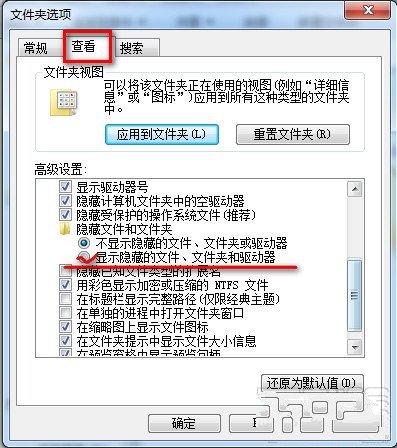 2:“查看”-“高级设置”-“显示隐藏的文件...”,点击应用,再点击确定