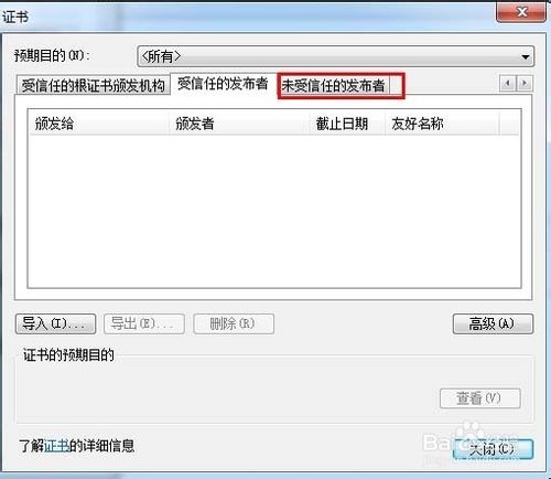 3、在win7系统xitongcheng.com/win7/打开的证书界面中,切换到“未受信任的发布者”标签页,在里面选择要删除的发行者;