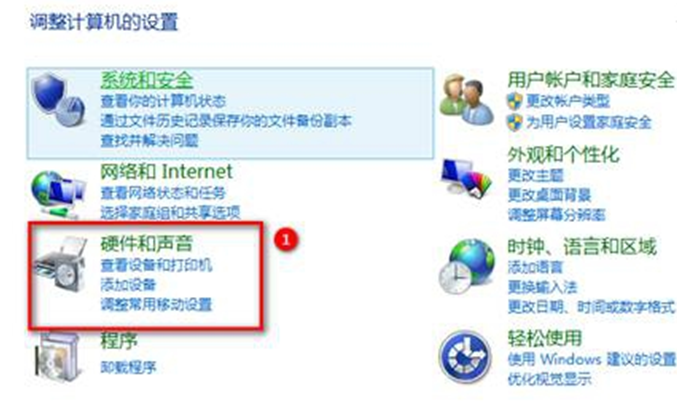 2. 在打开的控制面板选项中选择“硬件和声音”