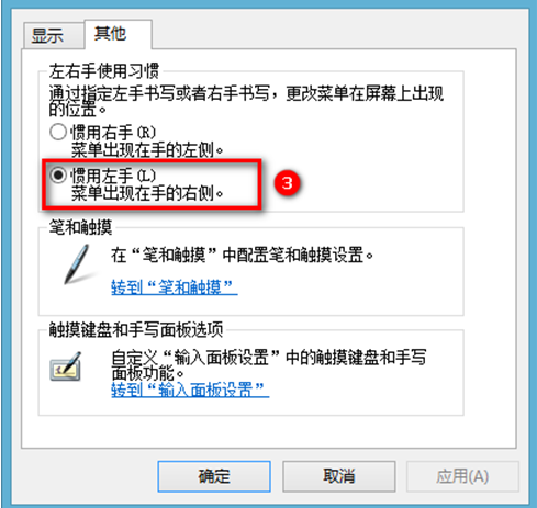 4. 在弹出的平板电脑设置中切换到“其他”标签页,选择“惯用左手”选项,然后点击“应用、确定”即可。