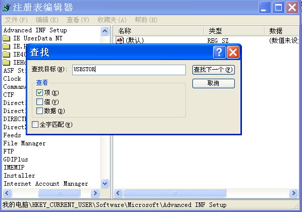 3、在注册表编辑器中来查找"USBSTOR",为加快查找速度,可将查看的“值”与“数据”前面的勾去掉。