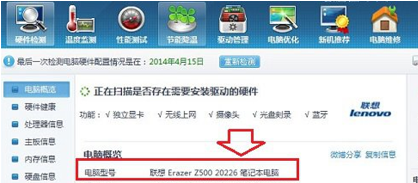 如果第一种方法,在笔记本机身没有找到型号信息的话,那么可借助鲁大师、驱动精灵等软件进行检测,打开软件选择硬件检测,在电脑概览中不可看到笔记本品牌型号信息了,如图所示。