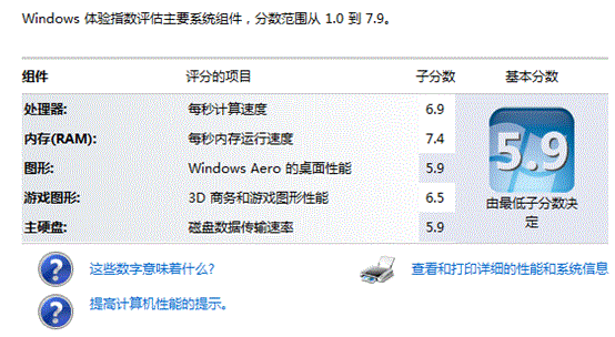 每个硬件组件都会接收单独的子分数,子分数是计算机的处理器(CPU)、内存(RAM)、硬盘(HDD)、Aero桌面图形、 3D 游戏图形5个硬件组件上测试的结果,其分数范围是 1.0 到 7.9区间。计算机的基础分数不是合并子分数的平均数,而是由最低的子分数确定的。例如,如果某个硬件组件的最低子分数是 5.9,则基础分数就是 5.9。
