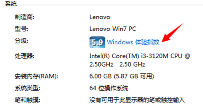 Windows 7的系统中打开计算机的属性,在分级一览中点击“Windows体验指数”,便能查看及更新系统分数了。