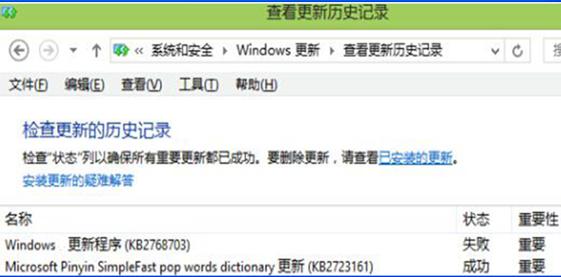 1、查看更新失败的记录:进入Windows7系统后,依次点击“开始——控制面板——系统和安全——Windows 更新——查看更新历史记录”,在这里可查看之前失败的更新,如图示: