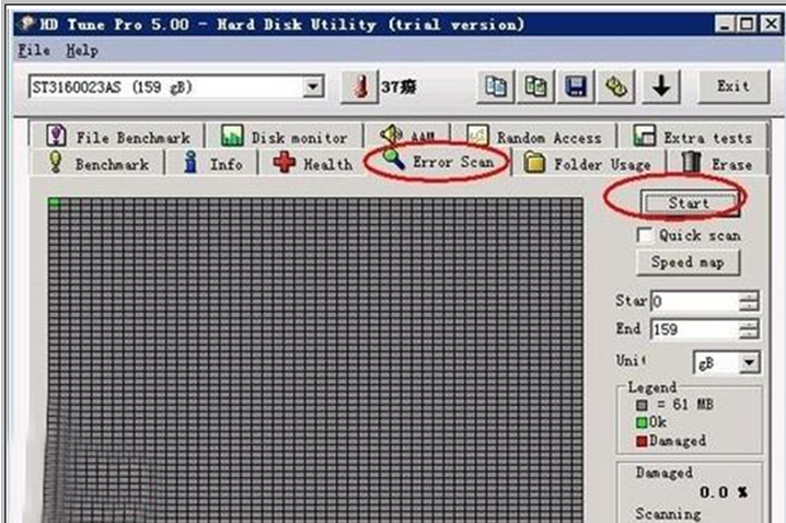 3、在HD Tune软件界面中,选择“Error Scan”,点击左上角的下拉列表选择要扫描错误的硬盘,然后点击右边的“Start(开始)”即可对硬盘错误进行扫描。