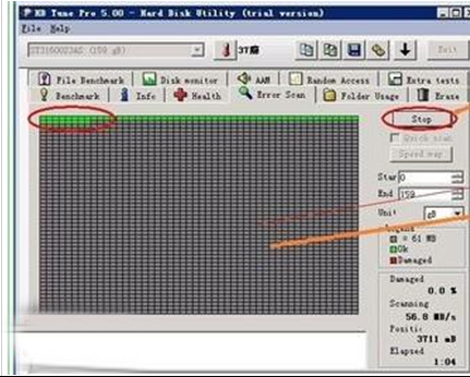 4、软件对磁盘进行错误扫描后,在显示框中有绿色的小框。绿色小框说明当前检测的磁盘位置一切正常。如果有红色小框,那说明你的Win7磁盘有故障,建议备份好数据修复硬盘,或者更换硬盘。