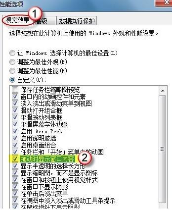 4、弹出性能选项对话框,在“视觉作用”选项的下拉列表中找到并选中“拖动时显示窗口内容”项。