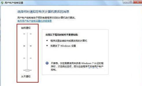 3、弹出的用户账户控制设置窗口中,将通知条件调到最低的“从不通知”,然后点击确定保存即可。