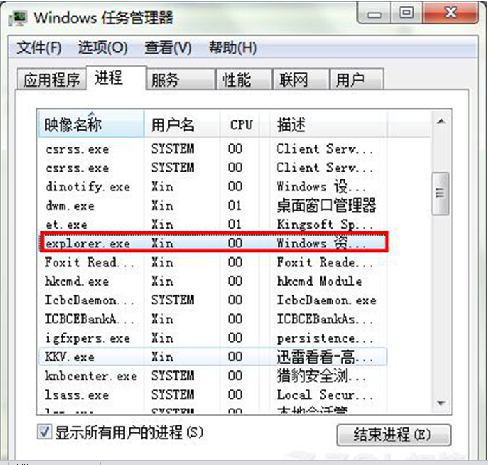 2、在任务栏空白处右键选择“Windows任务管理器”,切换到“进程”标签页,在列表中找到并选择“explorer.exe”进程,点击“结束进程”按钮